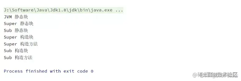 但是前面我们说了子类的 的方法调用之前,会调用父类的 的方法,于是会先去调用 Super 类的 static 的方法,再去调用 Sub 类的 static 方法,调用完成了之后。又去调用构造块,我们知道构造块执行的顺序在构造方法之前,也是先执行 Super 类的构造块,然后再去执行 Super 类的构造方法,最后再执行 Sub 类的构造块以及 Sub 类的构造方法。
