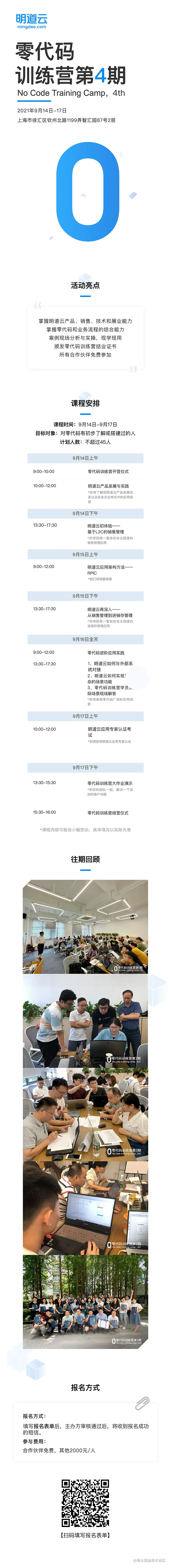 再启动!零代码第四期训练营报名开放中 明道云 2021-09-03 203 阅读1分钟 上月,由于全国疫情加峻,明道云零代码第四期训练营不得不暂时搁置。所幸全国防疫抗疫工作有效推行,目前国内大部分地区已恢复低风险,而第四期训练营也将继续开启报名通道!以下为最新确定的第四期训练营安排。 注意: 已报名过第四期训练营的用户将保留席位,明道云顾问会向其主动确认是否继续参与。 本期学员名额为45人,报名满员即止;若未满员,则于2021年9月10日(星期五)不再接受报名。