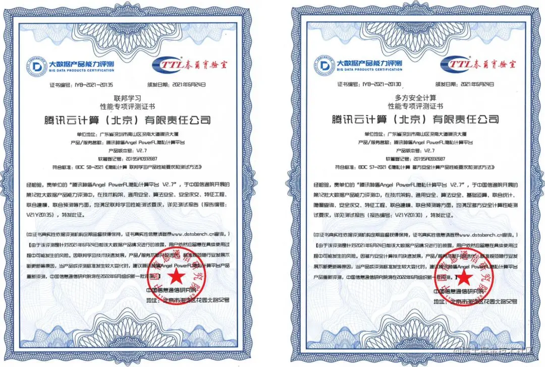 中国信通院“大数据产品能力评测”是国内首个权威大数据产品的评测体系,由中国信通院作为牵头单位,与学术界、产业界和领域用户紧密合作,联合制定评测标准,评审会专家由来自信通院、清华大学、中国科学院、 北京邮电大学、工商银行、光大银行、中国移动、联通数科等单位的专家组成。中国信通院“大数据产品能力评测”已经成为大数据领域权威的第三方评测品牌,成为供给侧产品研发和需求侧采购选型的风向标。腾讯自研的Angel PowerFL隐私计算平台通过了中国信通院的隐私计算产品测评与认证。