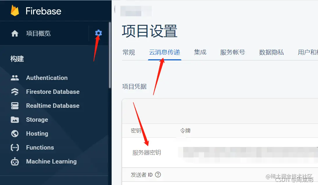 FCM官方文档 流程很清晰,感觉比百度的接入更加方便,不需要配置.so库啥的。创建应用啥的,创建完需要提供API密钥。其实就是图下的云消息传递中的服务器密钥。