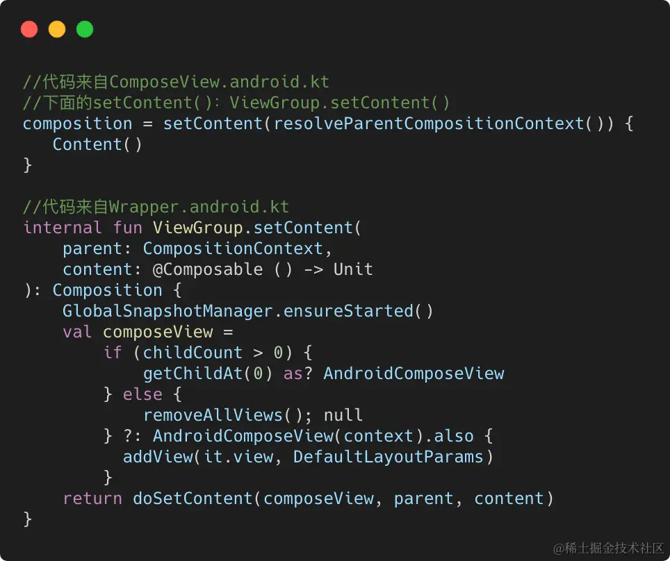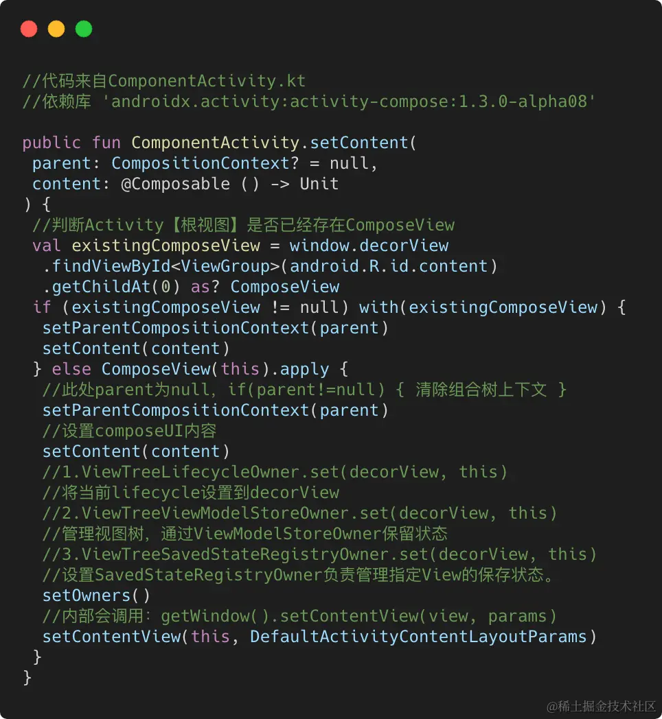 答案就在下面: 文章最上面我们从源码中得知:ComposeView内部有个setContent