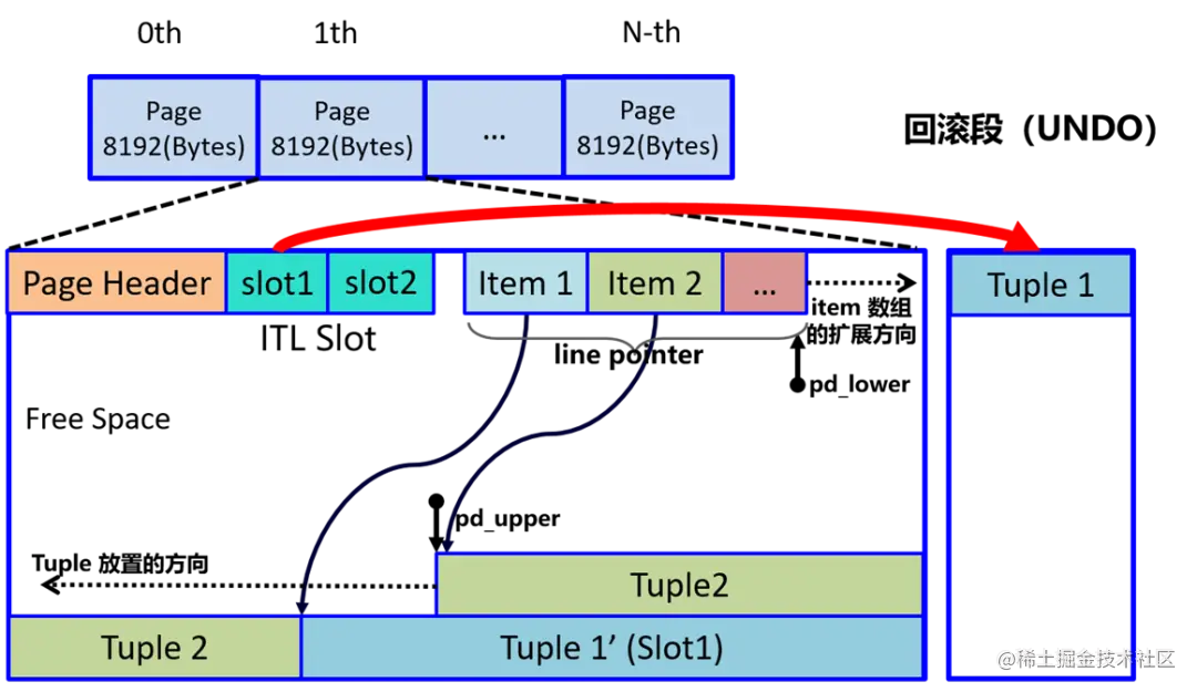图1:Ustore数据存储示意图:数据在原page页,undo通过指针单独管理