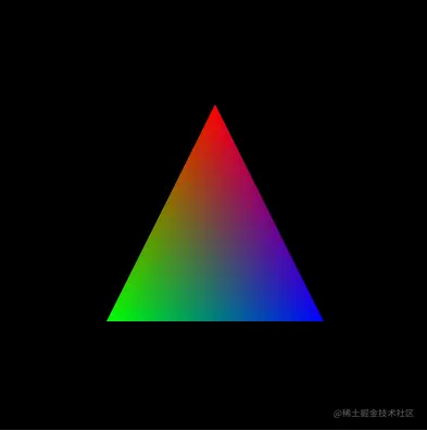 最后的运行结果如下,最后会发现得到了一个颜色平滑过渡的,三个角各是红、绿、蓝颜色的三角形: