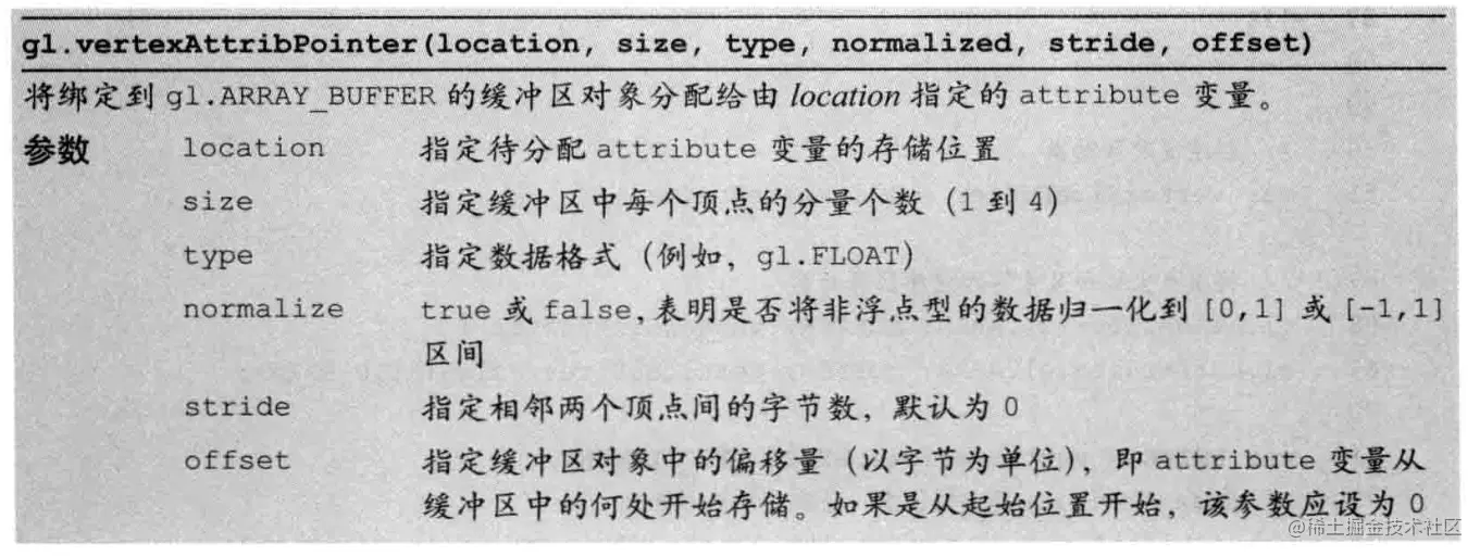可以看到创建缓冲区对象、将缓冲区对象绑定到目标、向缓冲区对象写入数据这三个步骤都是一致的。但分配attribute变量和连接attribute变量这两个步骤分别进行了两次。其中的关键点就在于gl.vertexAttribPointer()这个函数。之前使用这个函数都是使用的默认值,这里通过设置步进和偏移值,分别访问了缓冲区中不同的数据。