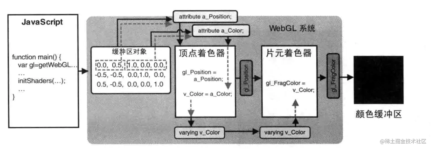 与之前的例子相似,数据仍然通过缓冲区传递到顶点着色器。在顶点着色器中,定义了两个attribute变量,分别代表位置和颜色信息: