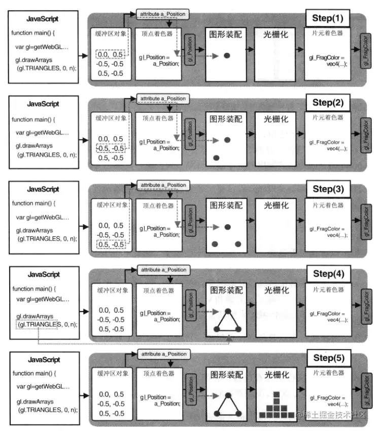 点组成线,线组成面,将孤立的点组成基本图形(图元)的过程就是图形装配。图形装配的输入数据就是顶点着色器中gl_Position得到的值,由gl.drawArrays()中第一个参数值来确定装配成什么样的图元。在这个例子中,顶点着色器告诉WebGL系统,准备了三个点,WebGL通过图像装配,将其装配成三角形。