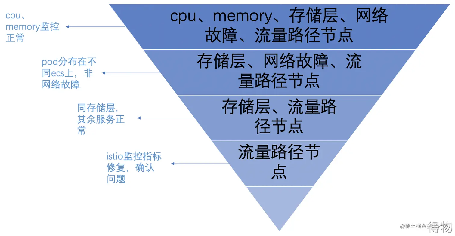 我们在收到告警信息时,首先需要判断受影响的范围,其次考虑可能存在的原因,再依据现有条件、现状,针对性的排除某些原因。问题的排查过程就如同一个漏斗,最终漏斗的最下一层就是问题的根因,如下所示: