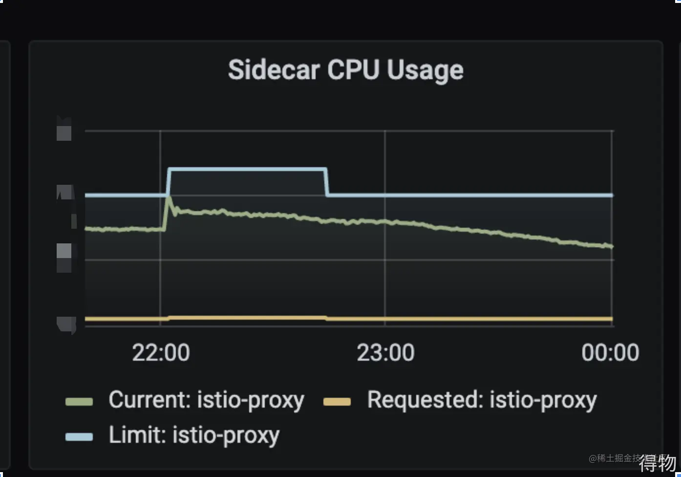 真实的istio的负载,明确的指明了此次告警的原因。最后,经确认,目前sidecar使用的资源为2c1g。服务初期使用的pod配置为1c512m, 随着业务发展pod数越来越多,所以选择了升级pod的资源配置为4c2g。并且经过服务拆分,该告警服务流量转发居多,导致istio的cpu负载过高,从而导致此次抖动。因为目前sidecar资源固定2c1g, 所以通过把服务配置降级为1c2g增加pod数量,pod数量与sidecar数量是1:1,从而增加了sidecar的资源池,避免后续出现此类抖动。