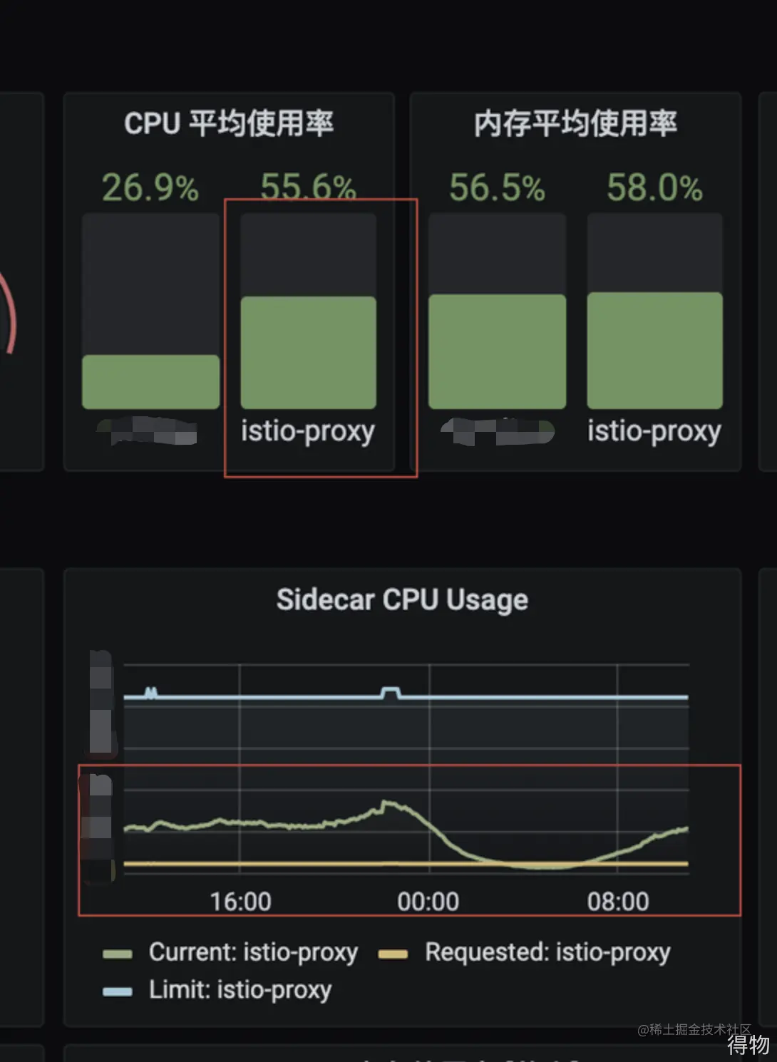 所以还是将目光转向流量路径节点的问题,寻求运维侧的同学支持,希望实时查看下istio的状态。这时候,我发现运维侧同学反馈的istio负载和监控面板中不一致,这里也就是团队成员走弯路的地方,因为istio的负载指标显示错误,所以跳过了该原因。经过多方排查,最终发现监控面板收集数据存在异常,经过修复监控数据展示,最终istio的真实负载如下: