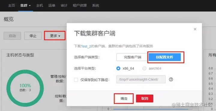 可通过以下两种方法进行配置: **方法一:**服务安装前通过脚本自动配置 1. FI集群上下载FI集群配置文件及用户凭证: 配置文件:登录FI页面,在【集群】页面点击【更多】,选择【下载客户端】。弹框中选择【仅配置文件】,点击【确定】。下载完成后解压。