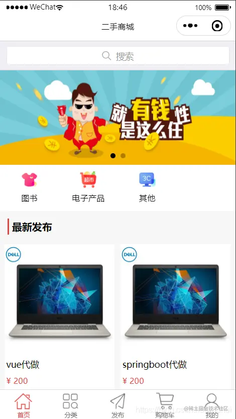 首页显示搜索商品,轮播图,商品分类,最新上架商品(可带推荐算法)