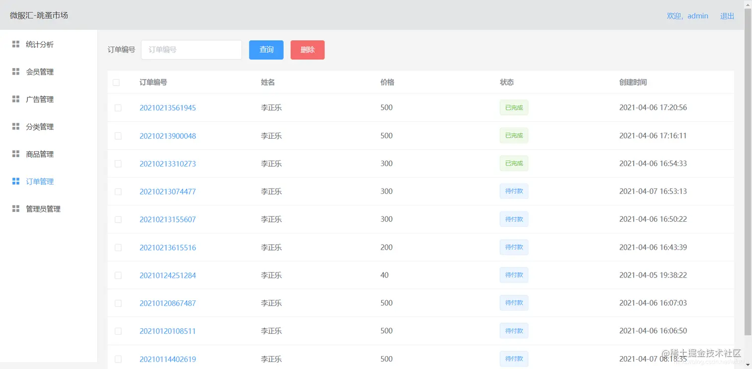 订单管理:显示用户下单信息及删除