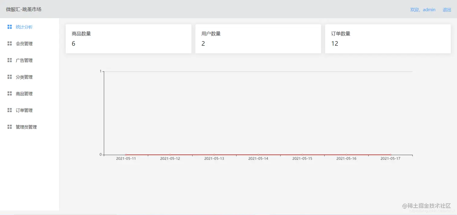统计分析:查看用户,商品,订单数量;统计近7日订单趋势