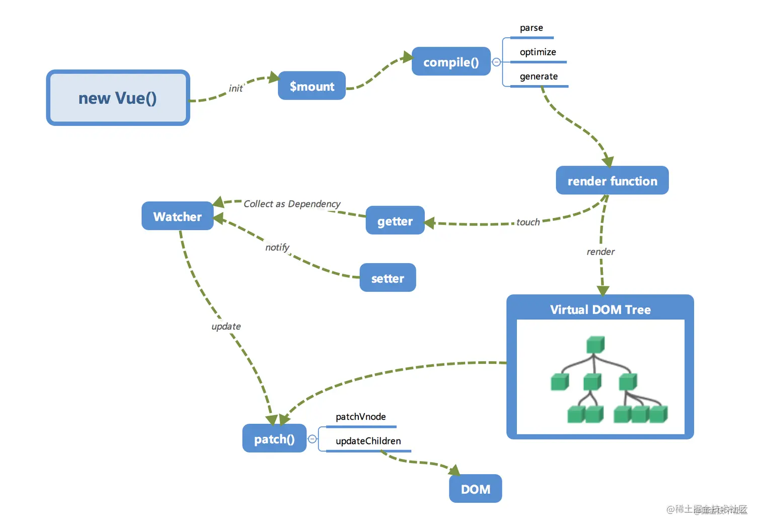 先上一张图,来自 掘金小册(推荐!) 剖析 Vue.js 内部运行机制⇲