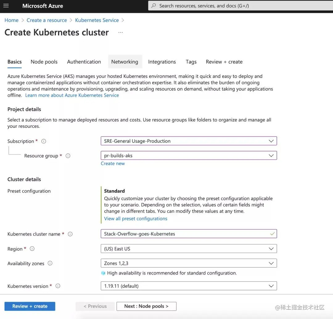 如今,Amazon 的 Elastic Kubernetes Service(EKS)、Microsoft 的 Azure Kubernetes Service(AKS)或 Google 的 Google Kubernetes Engine(GKE)等托管 Kubernetes 服务允许你在几分钟内设置自己的集群。例如,在 AKS 中,你只需单击门户中的几个按钮并填写几个表单: