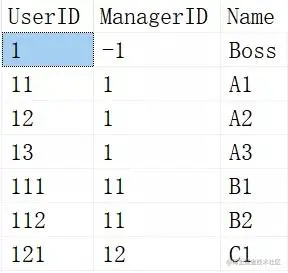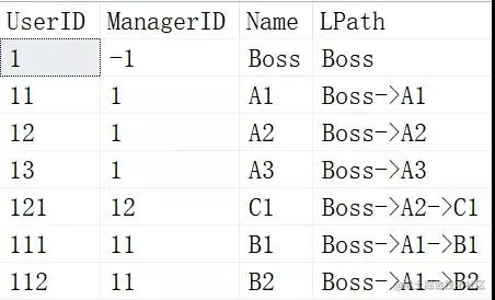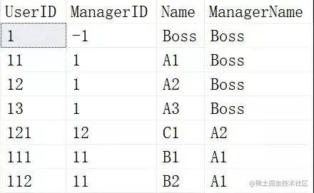 1、查询ManagerID=-1,作为根节点,这是递归查询的起始点。