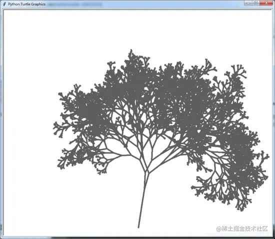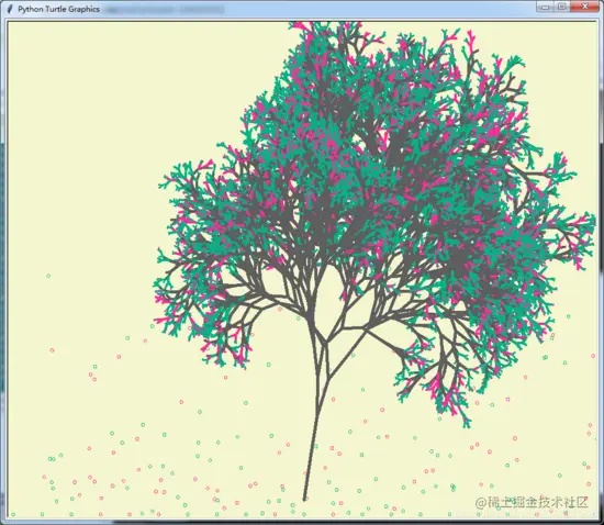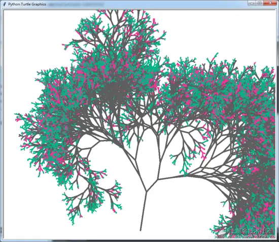 通过t.pensize()、t.color()更改笔的粗细与颜色,加长一下树的枝干和缩小一下笔的粗细: