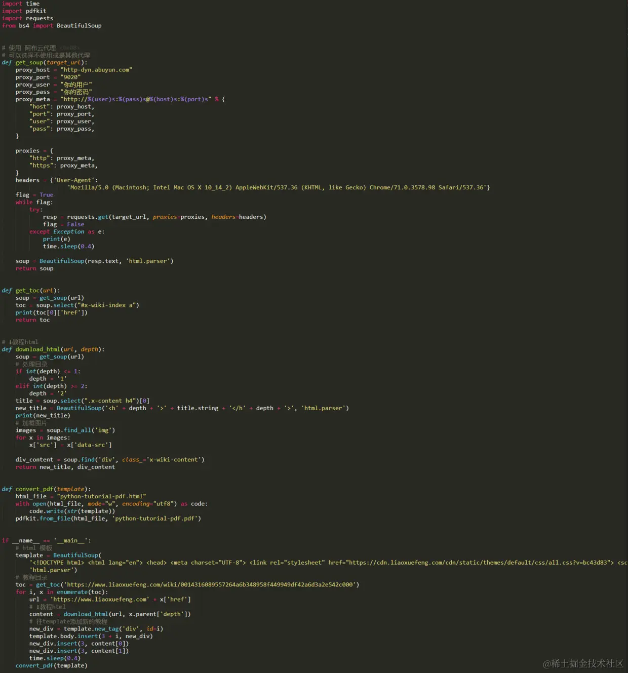 看来廖大的反爬虫做的很好,于是只好使用代理ip了,尝试了免费的西刺免费代理后,最后选择了付费的 阿布云 ,感觉响应速度和稳定性还OK。