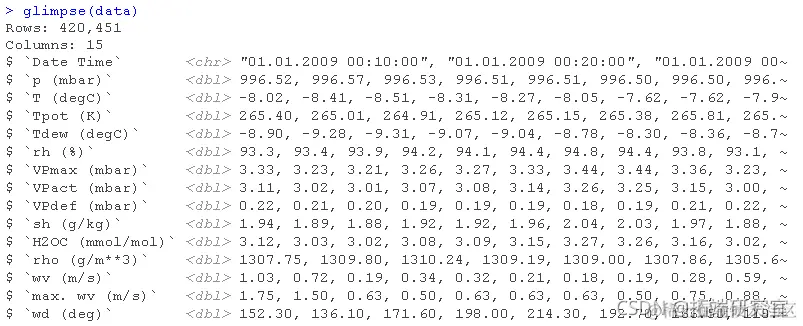 在这个数据集中,14个不同的量(如气温、大气压力、湿度、风向等)每10分钟被记录一次,历时数年。原始数据可以追溯到2003年,但这个例子仅限于2009-2016年的数据。这个数据集是学习处理数字时间序列的完美选择。你将用它来建立一个模型,把最近的一些数据(几天的数据点)作为输入,预测未来24小时的空气温度。