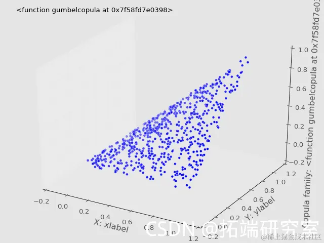 zeFigure=plot3d(U[样本],V[样本],copulapoints[样本], label=copulaName,