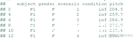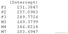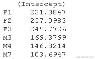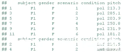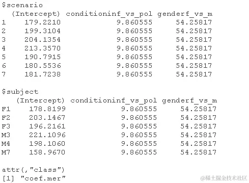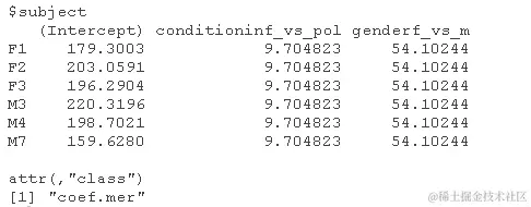 在这里,我们可以看到,这个模型为每个受试者产生了一个单独的截距,此外还有一个参数估计值/斜率的条件和性别,在各受试者中是恒定的。从这里,我们可以尝试根据这些系数来估计一个给定样本的平均音高 。例如,让我们尝试用他们估计的截距和作为女性的影响来估计受试者F1的平均数(x¯=232.0357)。