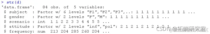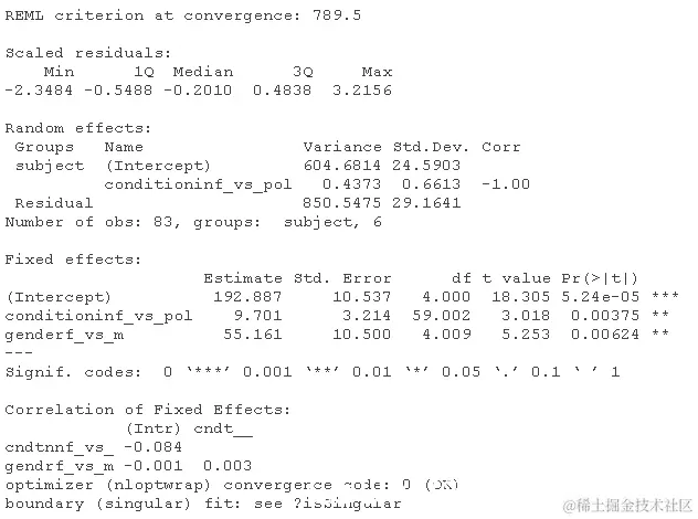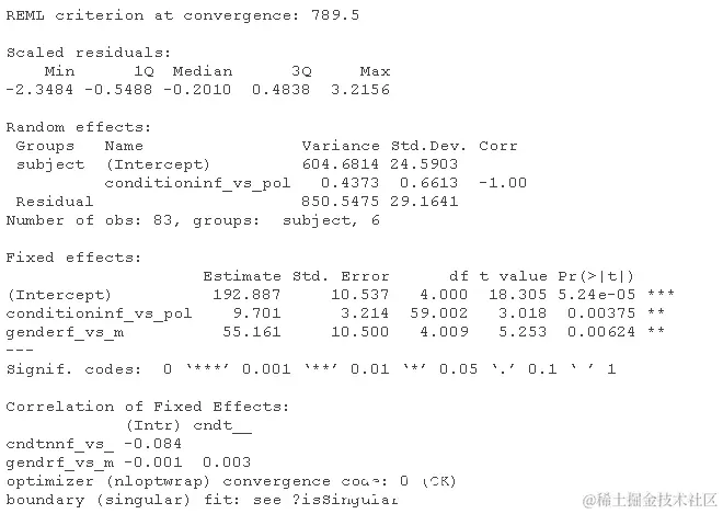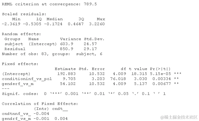 在上述模型中,我们的整个研究关键在于说明有关礼貌的东西。我们对性别差异不感兴趣,但它们是很值得控制的。这就是为什么我们对礼貌态度的影响有随机斜率(按被试和项目),而不是性别。换句话说,在礼貌态度对音调的影响方面,我们只模拟了按主体和按项目的变化。