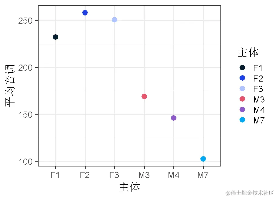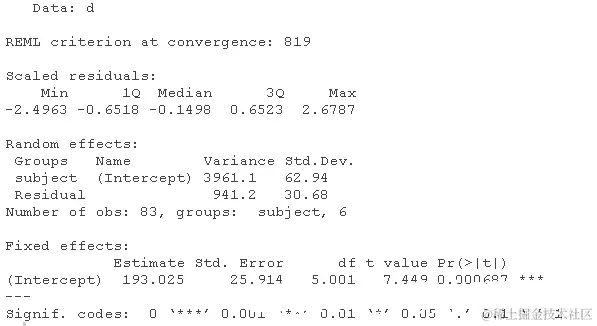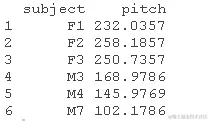 请注意,估计值与实际平均音高相当接近,我们可以看到,各受试者的实际平均音高是估计值(Intercept),而各受试者平均音高的标准差是随机效应的标准差(Std.Dev)。