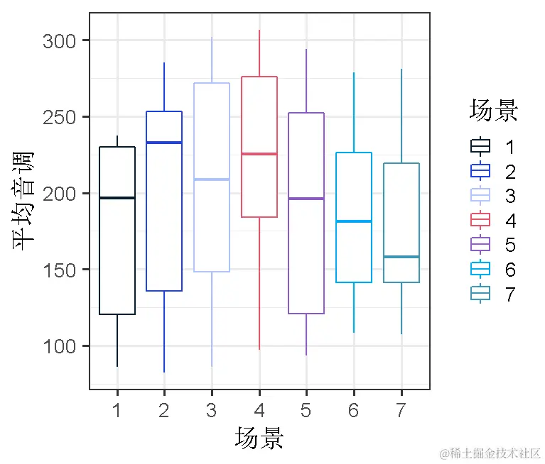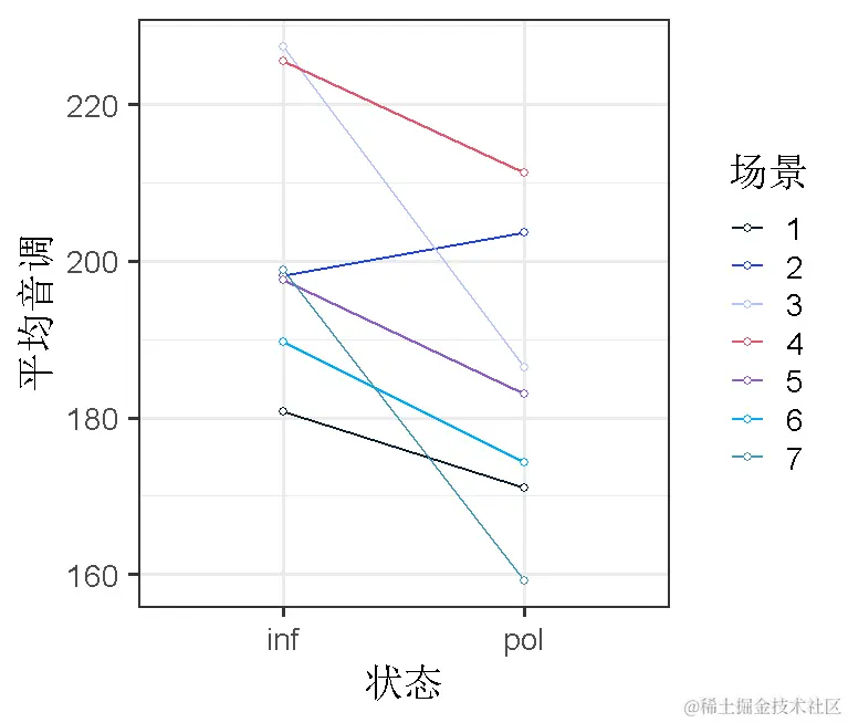 与受试者的随机截距相似,现在我们有了每种场景下的平均音高水平。