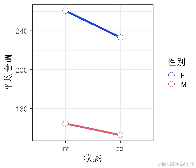 在这里,我们还将对比状态和性别,这样我们就可以看到条件在女性和男性之间的 "平均值 "的影响,以及性别在 "非正式 "和 "不礼貌 "之间的平均值的影响。