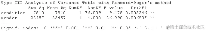 可以看到,我们的平均音调是192.88,非正式状态的音调比礼貌状态的音调高,b=9.71,t=3.03,女性的音调比男性高,b=54.10,t=5.14。我们可以使用一个经验法则,如果t大于2,就可能是显著的。