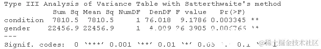 虽然对是否应该获得lmer()模型的p值有一些争论(例如,这个;大多数争论围绕着如何计算dfs),但你可以使用{lmerTest}包获得df的近似值(以及因此获得p值)。