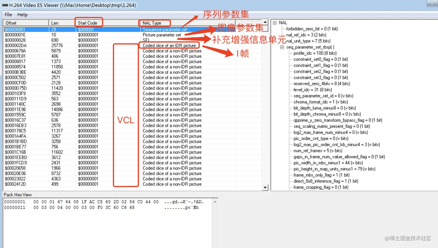 使用H.264 Video ES Viewer工具打开一个test.264文件 查看每个NAL的类型以及VCL数数据大小以及帧类型。