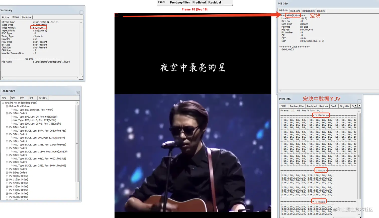 我们通过H264Visa工具来查看h264的 NALU、Slice、marcoblock、以及YUV数据如下: