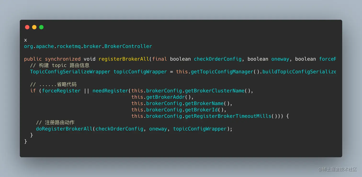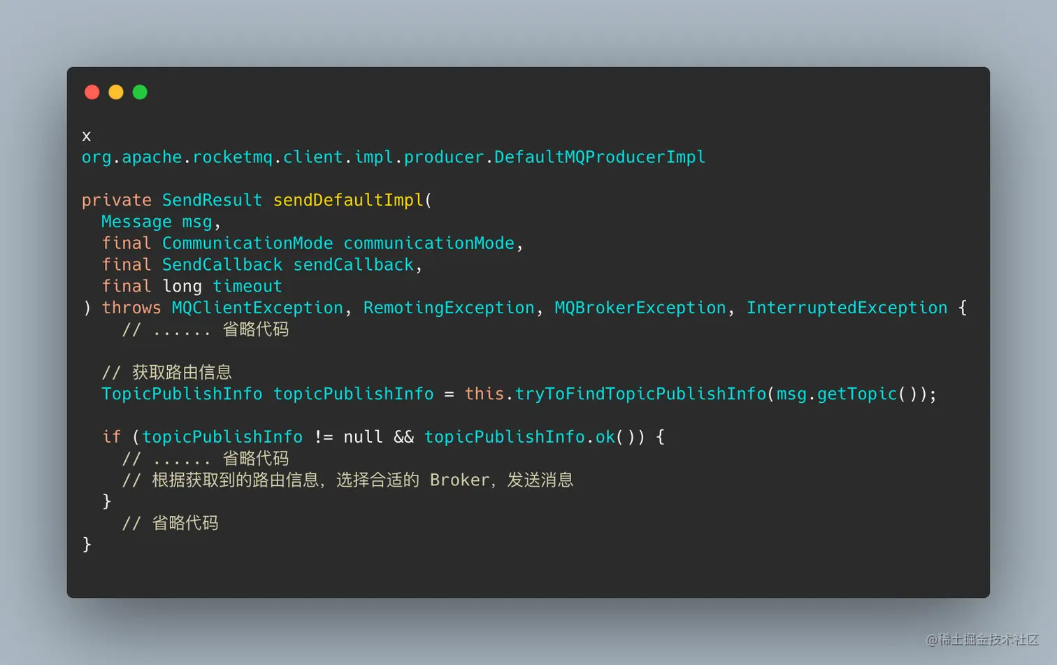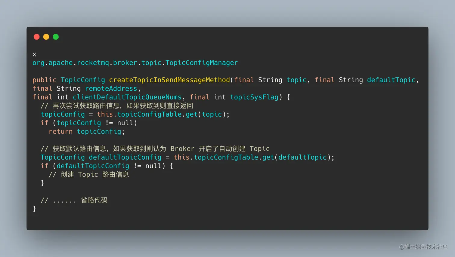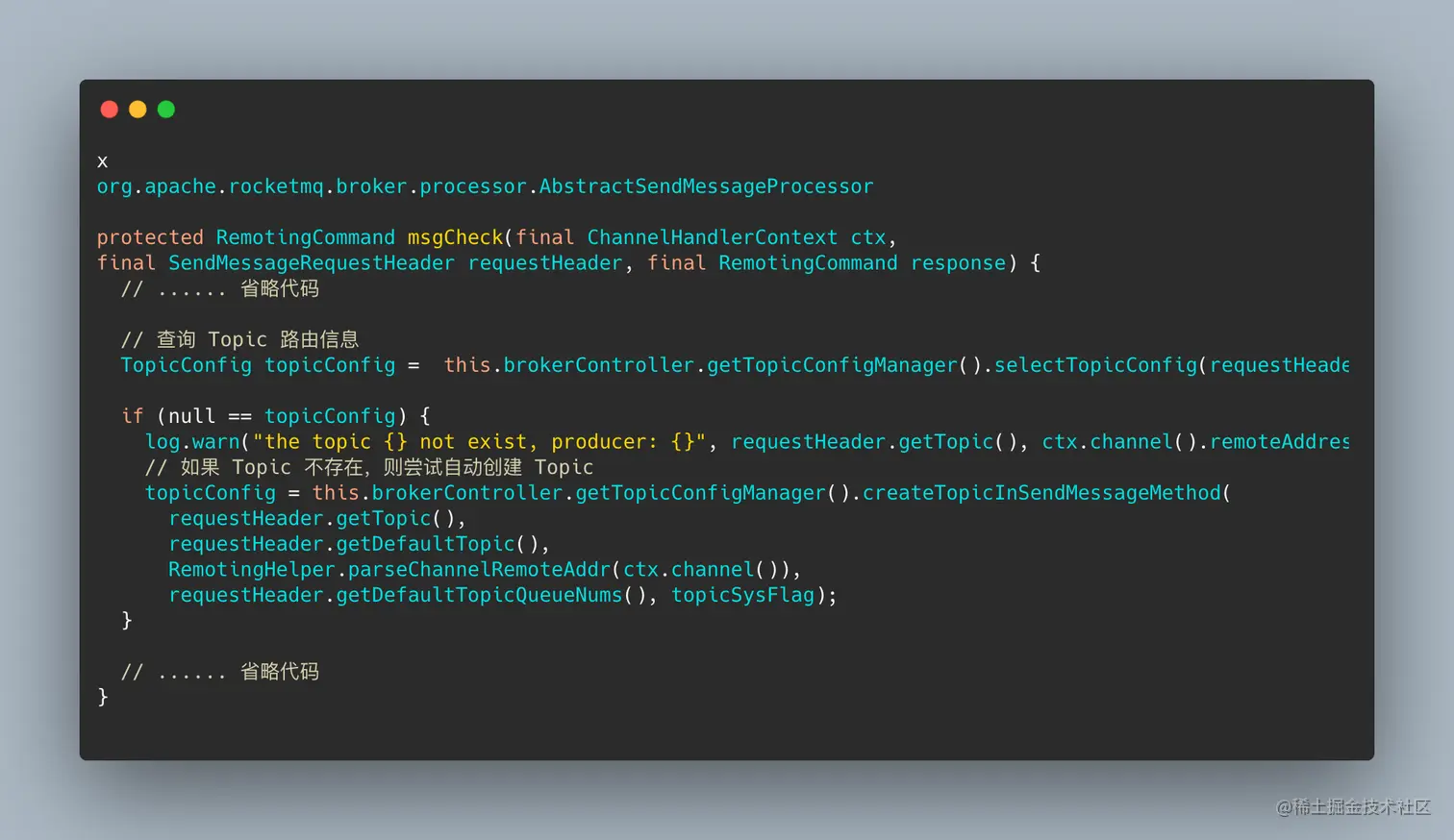 问题在于即使配置了这个参数,重启 Broker 服务之后,发送消息时还是如上的报错,因此打算仔细看看 RocketMQ 自动创建 Topic 的实现原理。