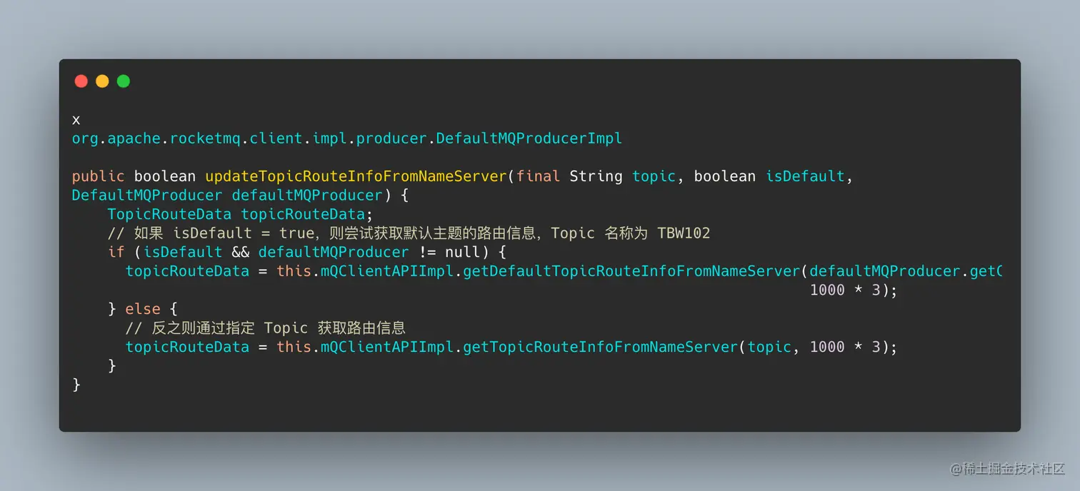 3.获取默认的路由信息,如果 isDefault = true,则尝试获取【默认主题】的路由信息, Topic 名称为 TBW102(与 Broker 注册的默认主题的路由名称相同)
