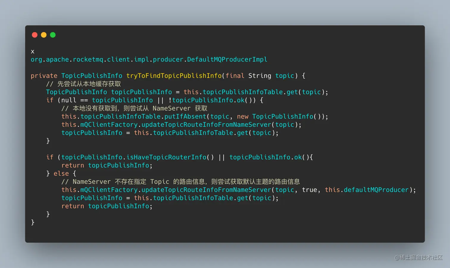 - 生产者发送消息时,会根据当前消息指定的 Topic 查询路由信息,如果本地缓存没有查询到,则尝试从 NameServer 服务查询