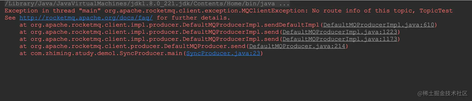 从报错信息可以看到: **Topic 对应的路由信息没有正常获取到(Topic 名称为 TopicTest)。**也难怪,Broker 启动后没有人为地去创建 Topic 对应的队列,发送消息自然没办法获取到路由信息。