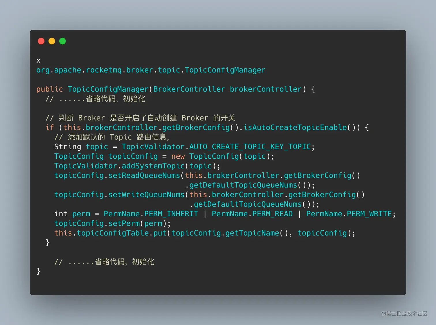 5.下面看到 topicConfigTable 对象的初始化过程,主要看到关于【自动创建 Topic】 的逻辑,其它代码先省略(初始化了一系列系统预设的 Topic 路由信息)