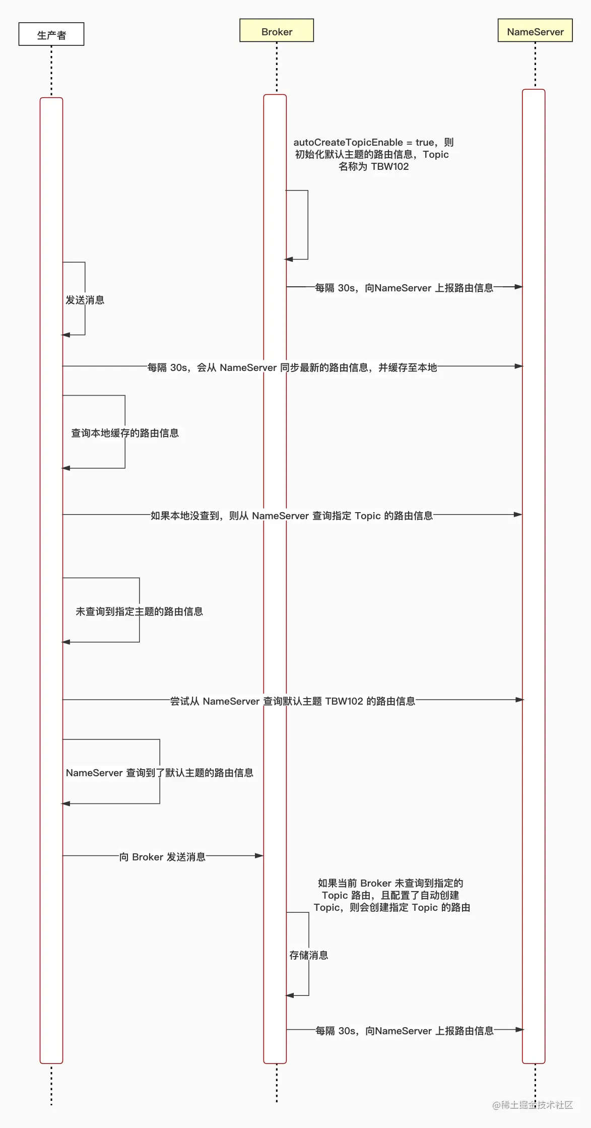 Broker 收到消息后,发现消息对应 Topic 不存在,且 Broker 允许自动创建 Topic,则会为消息创建 Topic ,并定时把路由信息同步至 NameServer