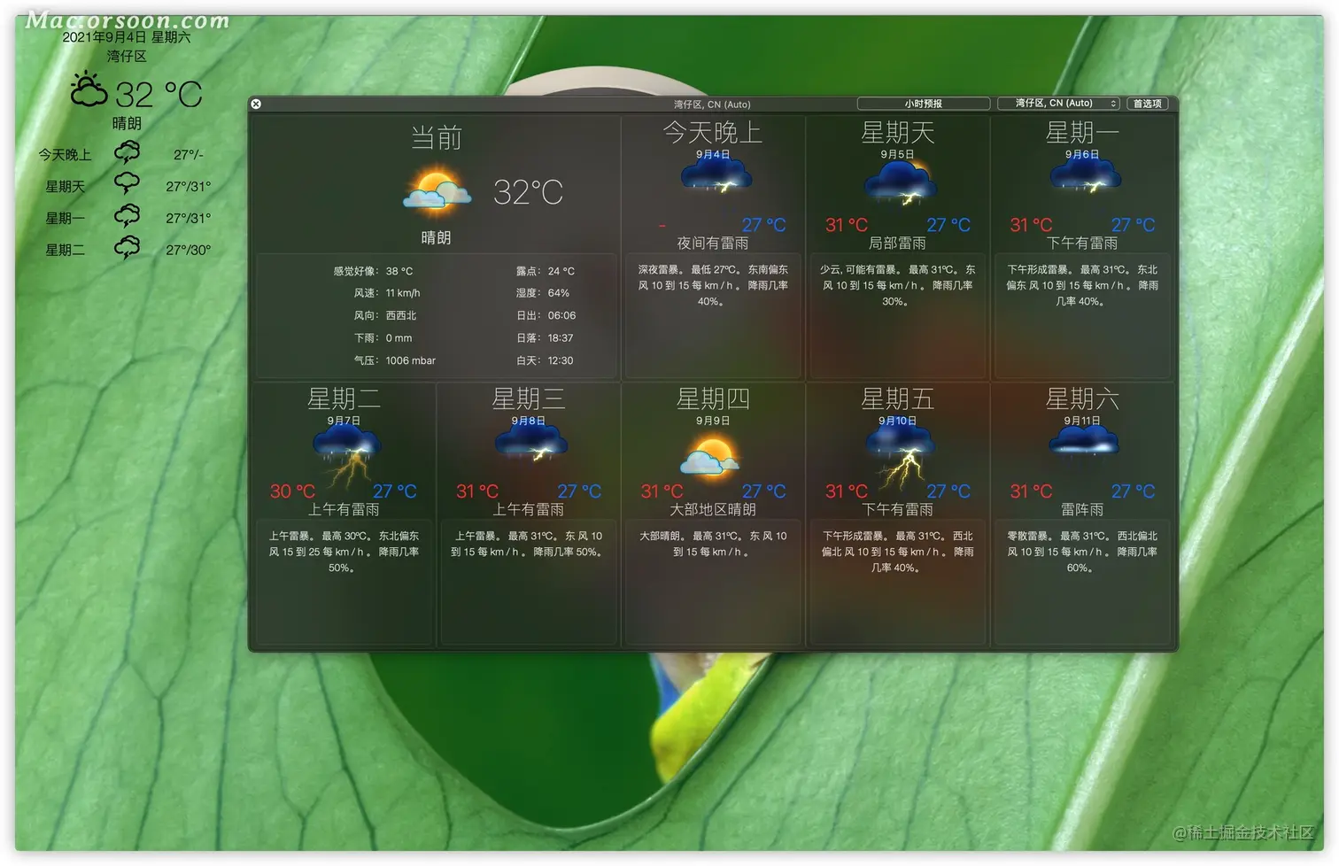 + 通过单击停靠栏图标获得详细的天气预报窗口