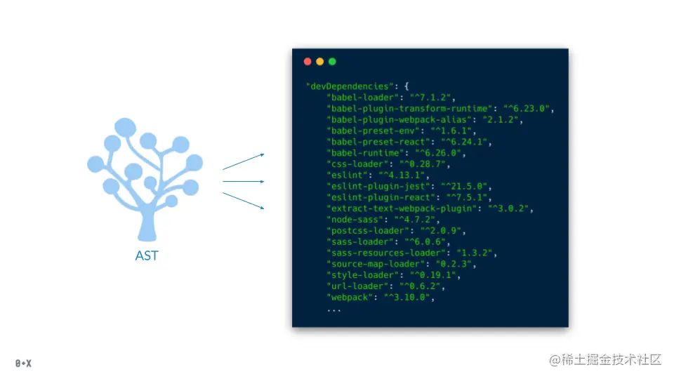 AST 抽象语法树,似乎我们平时并不会接触到。然而我们打开package.json会发现这个其实很多依赖其实都是通过ast来完成的。在我们的项目当中,CSS 预处理,JSX 亦或是 TypeScript 的处理,Javascript 转译,代码压缩,Webpack, Vue-Cli,babel,这些插件经常都能被用到