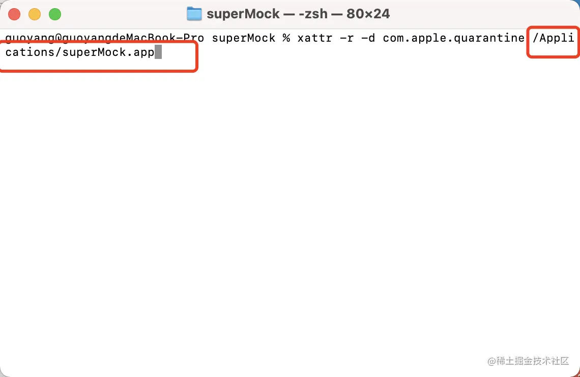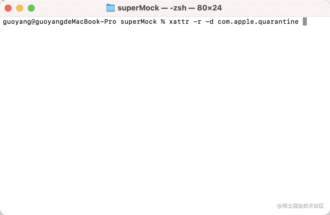 1:打开终端,输入命令: xattr -r -d com.apple.quarantine 先不要回车。注意,后边加个空格。如下图: