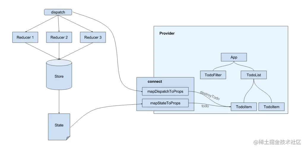 总结起来就是:如果你如果想在其他项目中复用这个组件的话,建议使用 mapStateToProps 。最后放一张经典的图,形象地表示了状态是如何从 store 流入组件的 props 中的: