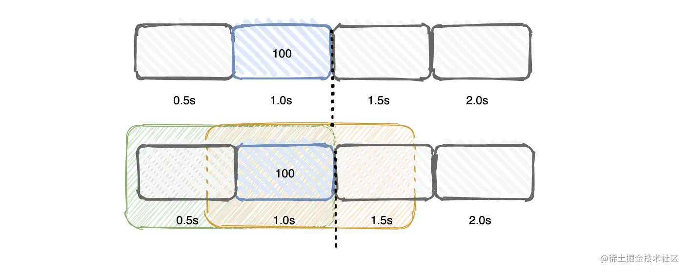 相比计数限流,固定窗口多了个窗口的概念。固定窗口限流的主要思想就是将某个时间段当成一个窗口,在这个窗口内有一个计数器,这个计数器用来统计在这个时间窗口内请求的次数,当请求的次数超过阈值,那么就会限流。当开启下一个窗口的时候,会进行重新计数。但是固定窗口有个缺点:假设我的限流的是100qps,我的窗口是以s为单位的,第一个窗口的后0.5s把100qps消耗完了,然后第二个窗口的前0.5s把100qps也消耗完了,那么两个加起来1s就200qps,显然不符合我们的限流规则。