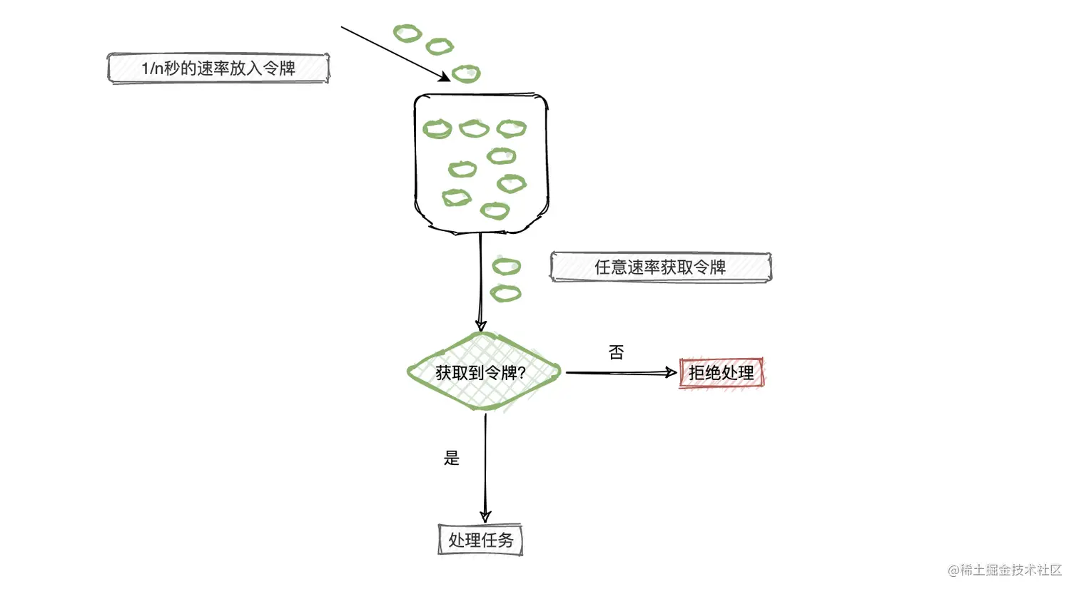 令牌桶的思想是以恒定的速率像向里放入令牌,当桶里的令牌满了,那么就不会放入,说明此时的请求速度跟不上令牌放入速度。这样在服务闲暇时,桶里会有足够的令牌,在突发流量的时候,因为桶里已经有足够的令牌了,也可以一定程度上满足突发流量。令牌桶算法支持出桶的速率是任意的,每次都需要从桶里获取令牌,如果获得了令牌表示可以处理任务,没拿到令牌就是限流了。