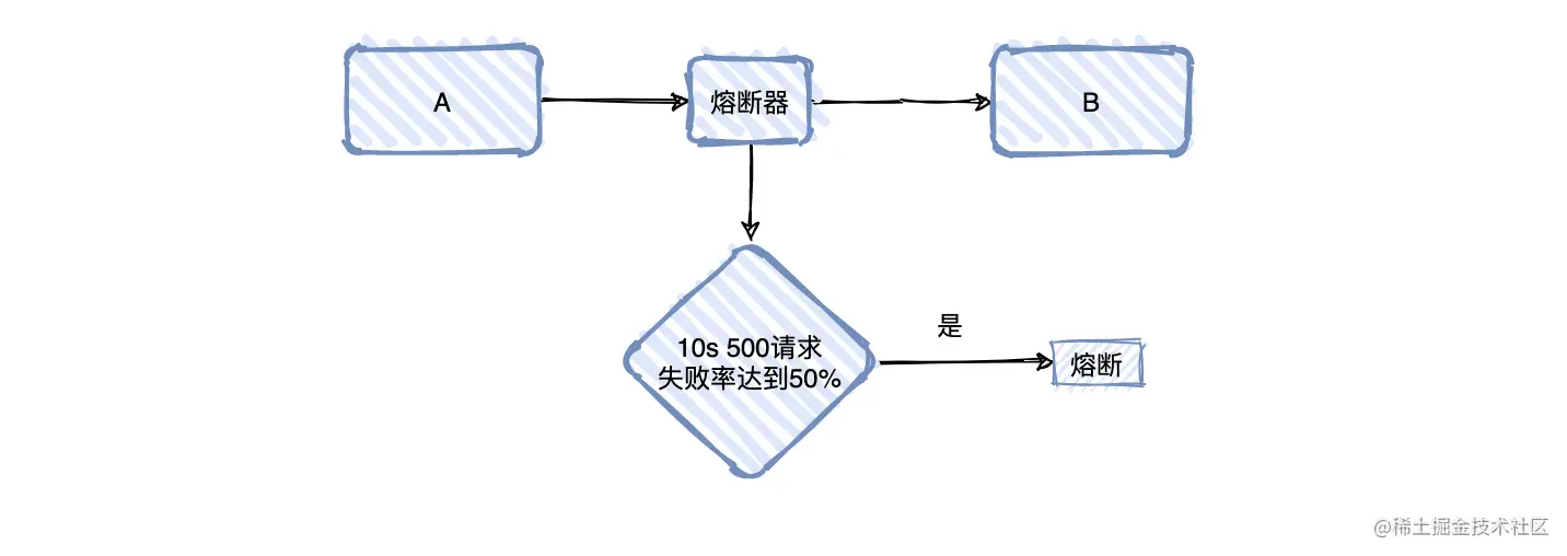 为什么需要熔断机制?在微服务中,由于服务拆分的很细,经常会出现服务A->服务B->服务C,如果C服务因为某些耗时操作,导致慢查询,接口的RT线性增长,这时会导致B服务的所有请求都超时,随着超时越来越多,tcp连接被打满,服务B也出现问题,服务B出现问题之后,会导致A的超时也逐渐增加,同样也出现A服务不可用的情况。可以发现因为服务C的问题导致相关联的服务都出现不可用的情况,引起雪崩。我们应该在服务C出现连续不可用的时候,切断服务B与C的通信,这就是熔断。当然我们也不能一直熔断,如果服务C好了,我们还还得继续提供服务,那么这就涉及到熔断算法了。