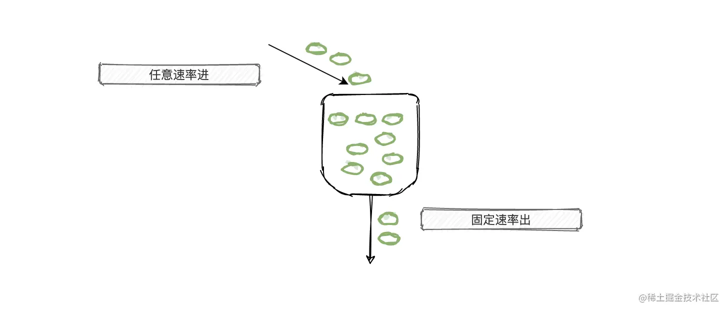漏桶算法的思想是:外部速率是变的(请求有密集有稀疏),而桶的容量是固定的,并且总是以恒定的速率出桶,当处理不过来了(桶满了),多余的请求就会被限流(桶溢出)。漏桶法适合以恒定速率处理的场景。