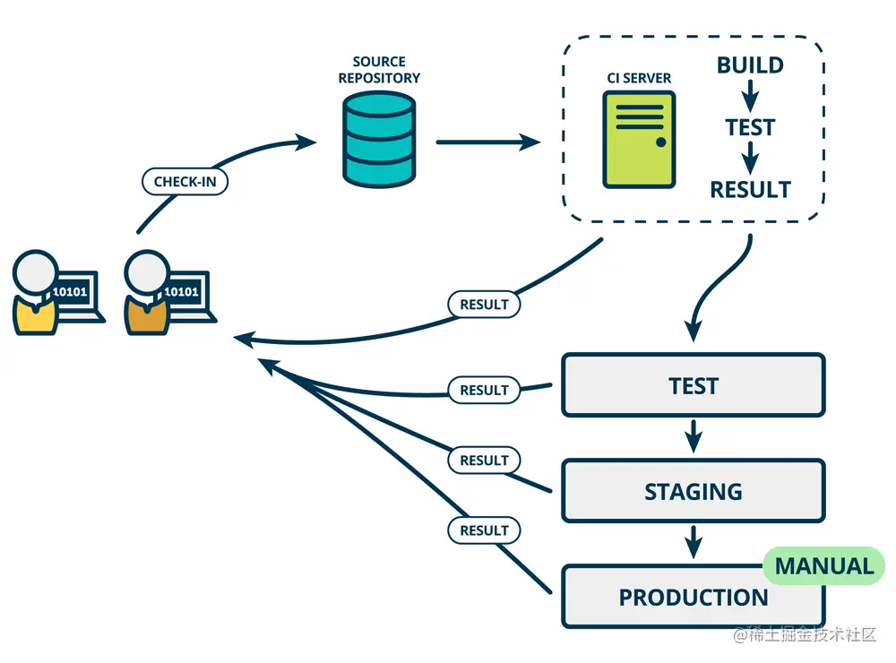 持续集成(Continuous Integration):,开发人员能够频繁地将其代码集成到公共代码仓库的分支中。CI可以在源代码变更后自动检测、拉取、构建和进行单元测试。CI的目标是快速确保开发人员新提交的变更是好的,并且适合在代码库中进一步使用。