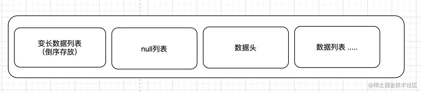 变长字段的长度列表,null值列表,数据头,column01的值,column02的值,column0n的值......