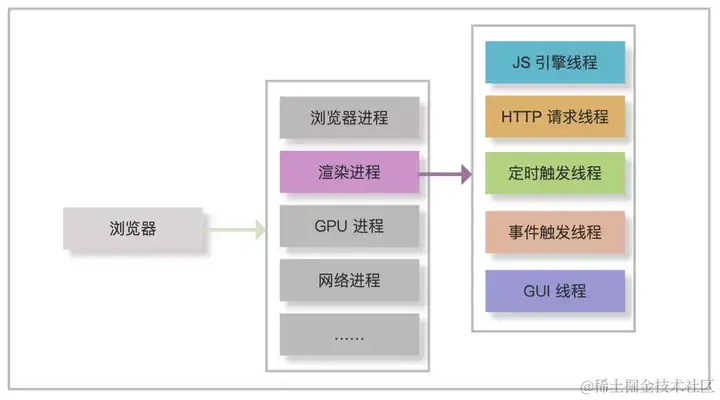 以 Chrome 为例,浏览器不仅有多个线程,还有多个进程,如渲染进程、GPU 进程和插件进程等。而每个 tab 标签页都是一个独立的渲染进程,所以一个 tab 异常崩溃后,其他 tab 基本不会被影响。作为前端开发者,主要重点关注其渲染进程,渲染进程下包含了 JS 引擎线程、HTTP 请求线程和定时器线程等,这些线程为 JS 在浏览器中完成异步任务提供了基础。